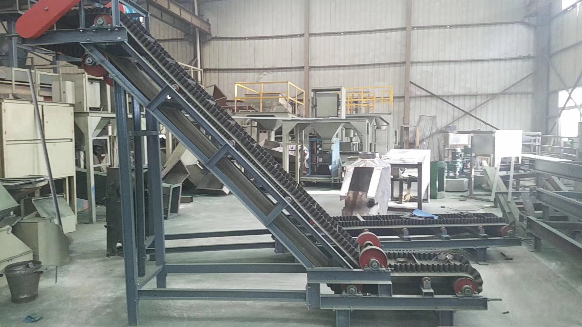 大倾角皮带机-DJ挡边皮带机-厂家直销(大倾角皮带机使用说明书) 大倾角皮带输送机(挡边带式输送机)产品概述: 大倾角皮带输送机(波状挡边带式输送机)是一种新型连续输送设备,它具有输送量大(同其它输送机相比,输送能力提高1.5~2倍);其通用性强(基本件与通用型带式输送机相同),适用范围广(适用于输送碎石、石灰石、煤炭、砂、粘土、烧结砂粉、木屑、粮食等物料;适用于单位质量为500~2500kg/m3,*大块度约为100~250mm的物料); 结构简单、维护方便、占用空间小且节省投资(可取代