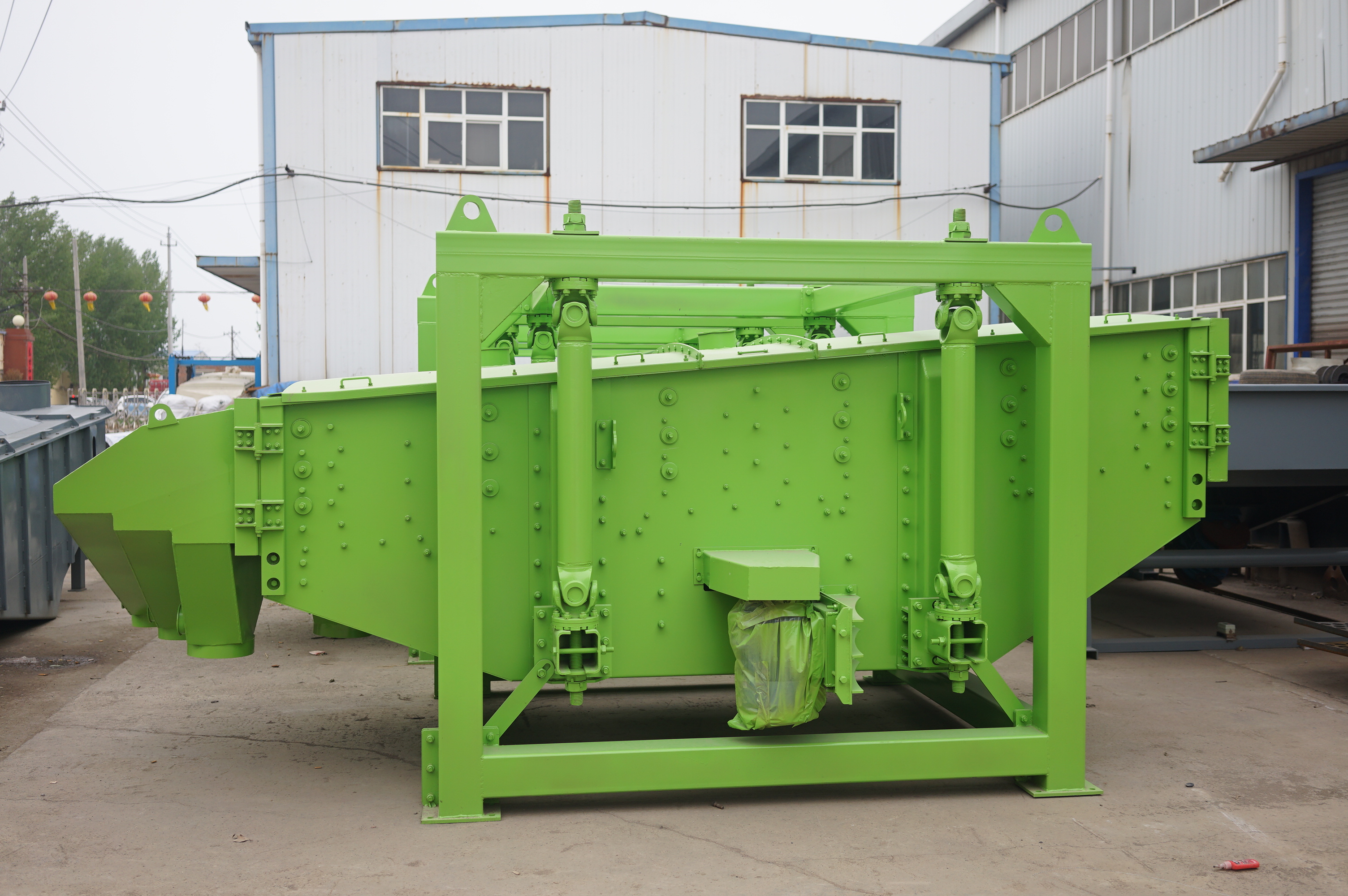 直线振动筛因为其结构简单,耐用,筛分效果突出,已经广泛应用在了食品,化工,矿业,冶金,建筑等各个行业。直线振动筛其振动轨迹是一复杂的空间曲线。该曲线在水平面投影为一圆形,而在垂直面上的投影为一椭圆形。调节上、下旋转重锤的激振力,可以改变振幅。而调节上、下重锤的空间相位角,则可以改变筛面运动轨迹的曲线形状并改变筛面上物料的运动轨迹。振动筛利用振子激振所产生的往复旋型振动而工作的。振子的上旋转重锤使筛面产生平面回旋振动,而下旋转重锤则使筛面产生锥面回转振动,其联合作用的效果则使筛面产生复旋型振动。