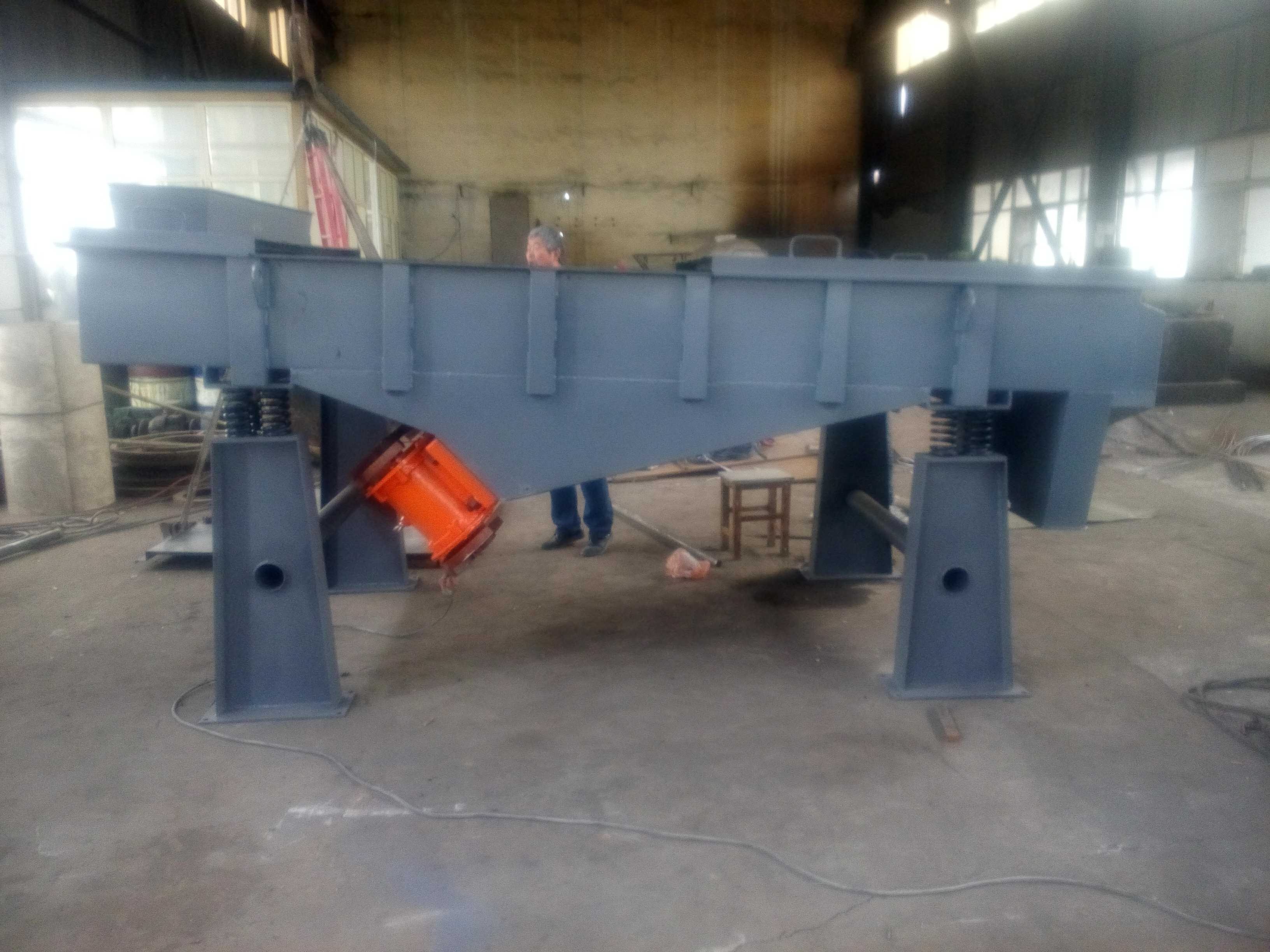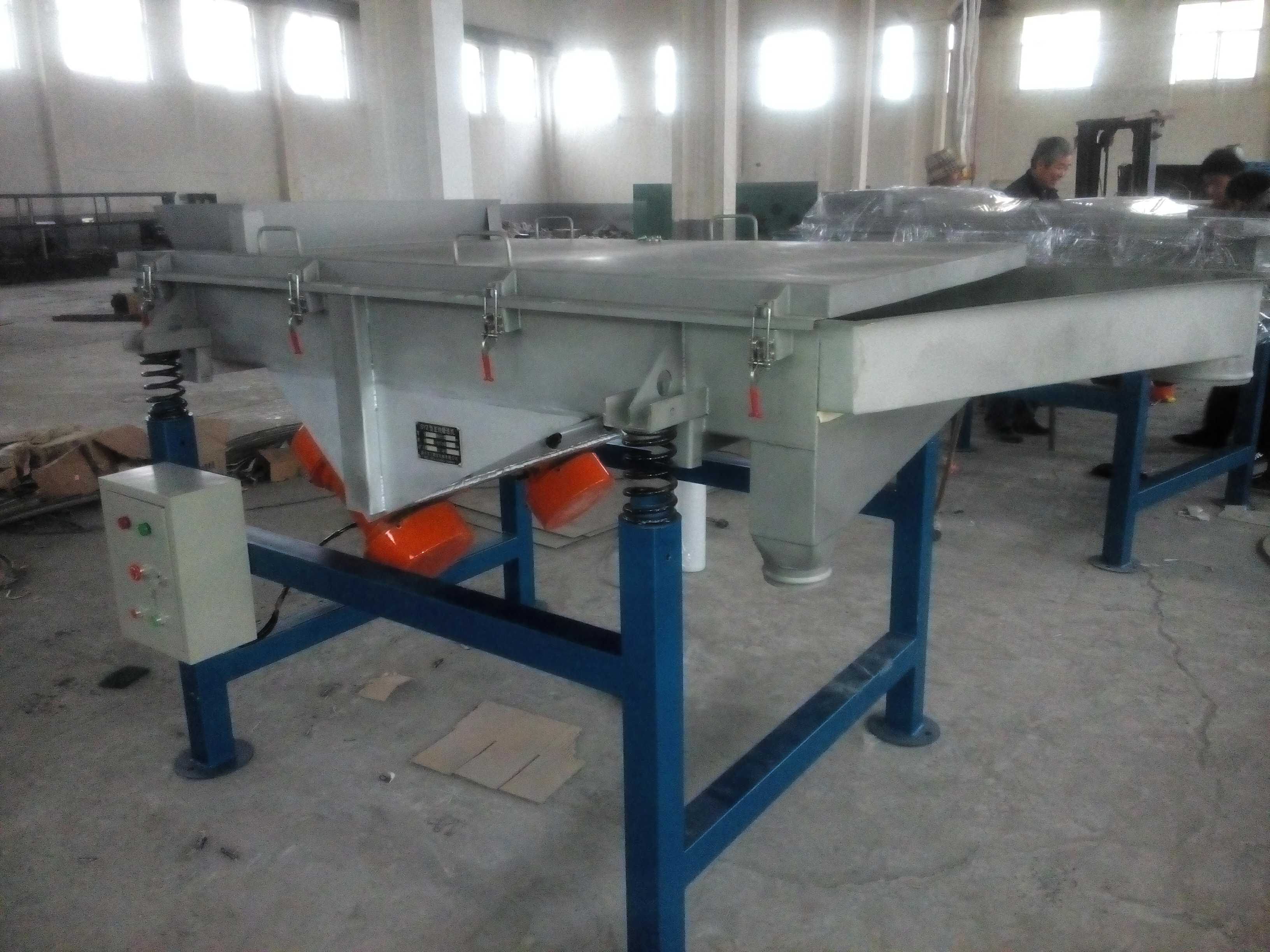 直线振动筛工作原理 直线振动筛为双振动电机驱动。当两台振动电机做同步、反向旋转时,其偏心块所产生的激振力在平行于电机轴线的方向相互抵消,在垂直于电机轴的方向叠为一合力,因此筛机的运动轨迹为一直线。两电机轴相对筛面在垂直方向有一倾角,在激振力和物料自重力的合力作用下,物料在筛面上被抛起跳跃或向前作直线运动,从而达到对物料进行筛选和分级的目的。适用于粒度在0.074—5mm,含水量小于7%,无粘性的各种干式粉状或颗粒状物料的筛分。大给料粒度不大于10mm.。 直线振动筛图纸 工作特点 该产