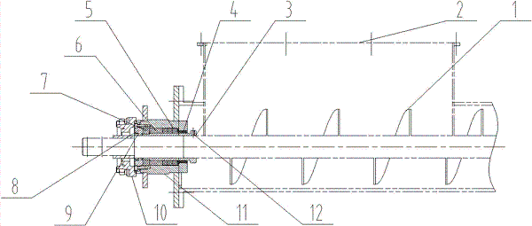 本技术新型涉及 螺旋输送机 输送领域,具体属于应用于食品、化工、医药、粮食行业的螺旋输送机防漏粉轴承密封装置。 背景技术: 在化工、食品、医药、粮食行业,物料都需要有距离的输送,螺旋输送机是在这种情况下常用的输送方式。现有的螺旋输送机在使用时,常出现两端密封座因密封不严,密封端物料泄露严重漏料,泄漏物渗入轴承内,就会造成螺旋输送机运转一段时间轴承座的轴承便会卡死。同时也会造成物料浪费,污染环境。 技术实现要素: 本技术的目的是提供一种螺旋输送机防漏粉轴承密封装置,为化工、医